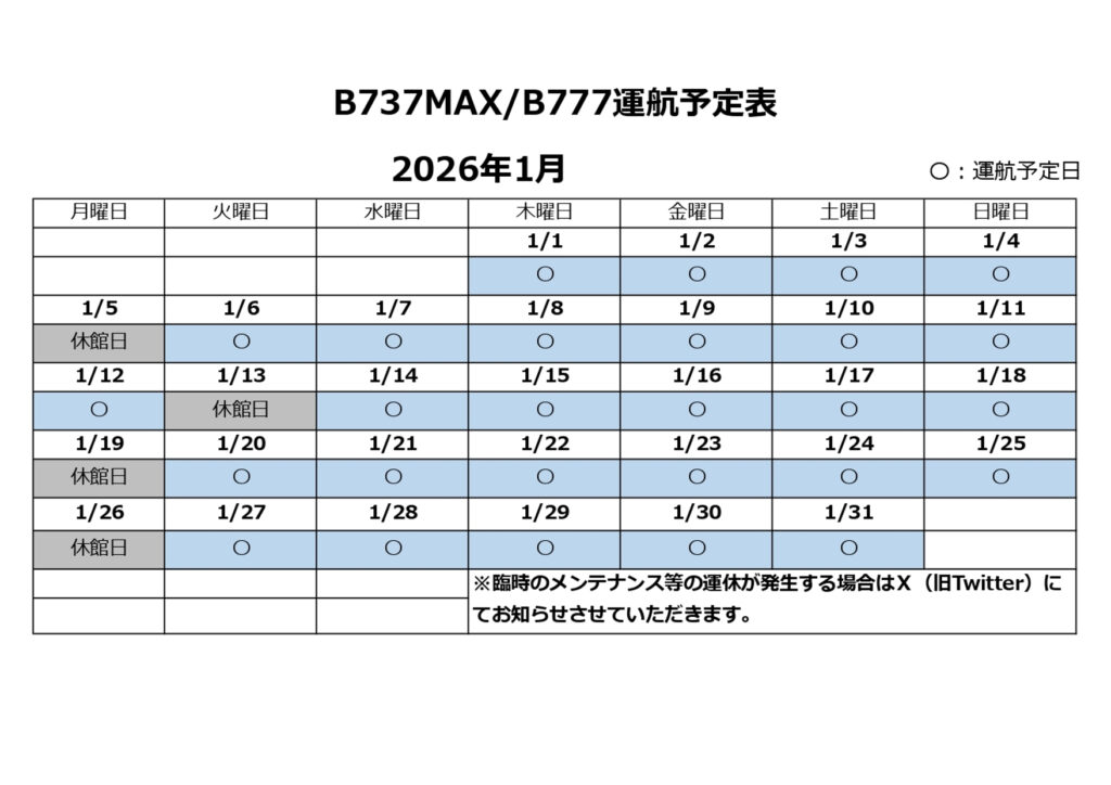 Experience corner [January] B737MAX/B777 Simulator Operation Dates 2026.01.16 The flight schedule for the B737MAX and B777 flight simulators in January 2026 is as follows: In the event of emergency maintenance, we will notify you via X. Please check the flight schedule.