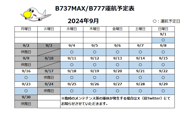B737MAXとB777フライトシミュレーターの2024年9月の運航予定は以下の通りです